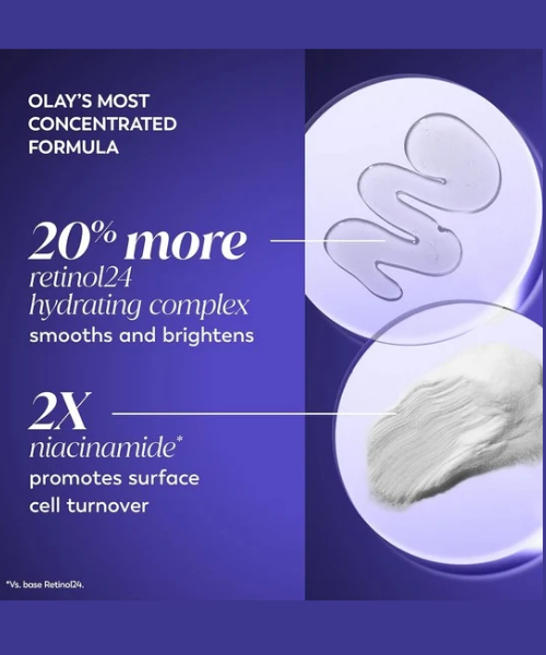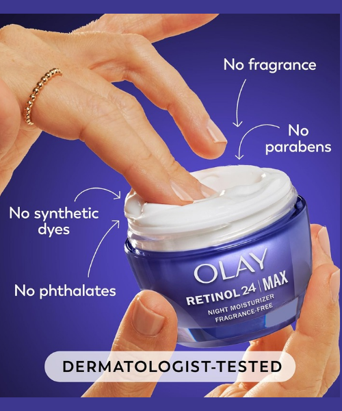 Olay Retinol 24 MAX is a powerful anti-aging night cream designed to smooth fine lines, reduce wrinkles, and deeply hydrate your skin while you sleep. Formulated with a high-strength Retinoid Complex, Peptides, and Glycerin, this non-greasy cream absorbs quickly and delivers 24-hour hydration without irritation. Its fragrance-free formula makes it ideal for sensitive skin. Wake up to smoother, firmer, brighter-looking skin every morning.