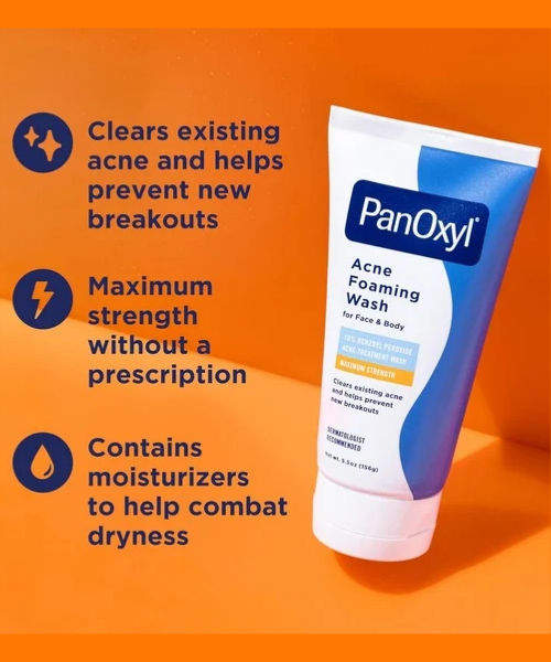 The PanOxyl Acne Foaming Wash uses 10% benzoyl peroxide, the highest over-the-counter strength, to kill acne-causing bacteria and deeply cleanse pores. This powerful antimicrobial formula helps treat existing breakouts while preventing new pimples, blackheads, and whiteheads from forming.