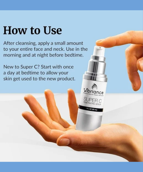 The Vibriance Super C Serum is a powerful multitasking anti-aging treatment designed specifically for mature skin. This advanced formula combines stabilized Vitamin C, hydrating ingredients, and skin-firming nutrients to brighten dull skin, reduce age spots, and visibly smooth fine lines and wrinkles.